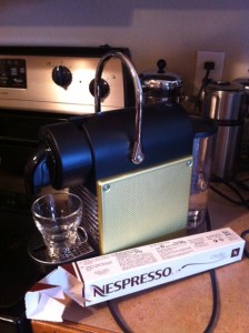 So here’s my cute little lime-green Pixie. (My colors are black or red, but this was a demo model and I got a really good price on it.) My only complaint so far: I ran out of the sample pods way too quickly! I was desperate enough that I drank the decaf ones today until my order arrived.