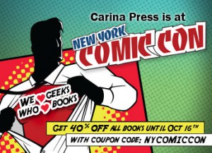 To celebrate NY ComicCon, Carina Press is offering 40% off everything this weekend using  coupon code NYCOMICCON.  Happy reading!