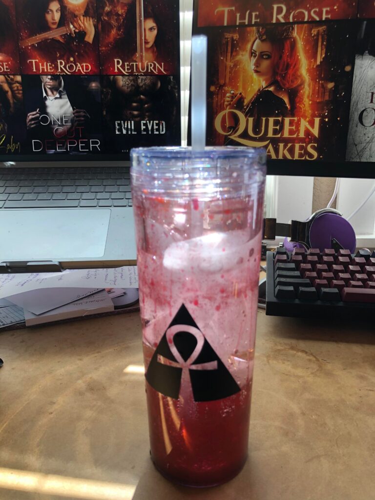 The cover artist for this series (Cover Me Darling) also has an Etsy shop (Black Lily Arts) and she made an incredible “bloody” House Isador tumbler. Check them out if you’d like one of your own!